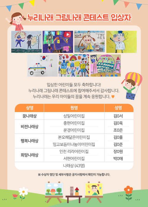 누리나래 그림나래 콘테스트 수상자 발표 안내 페이지 정보 작성자 아이렘 댓글 0건 조회 9,433회 작성일 22-06-13 12:41 본문 안녕하세요. 그림나래 콘테스트에 참여해 주셔서 감사드립니다.수상자 발표는 밑에 첨부파일을 참고해주시기 바랍니다.감사합니다. 첨부파일 2022년 수상자 명단.pdf (41.8K) 5677회 다운로드 | DATE : 2022-06-13 12:42:55 2022년 수상자 명단.hwp (128.0K) 5636회 다운로드 | DATE : 2022-06-13 12:42:55 검색 목록 글쓰기 이전글누리나래 콘테스트 안내 23.04.18 다음글그림나래 콘테스트 수상자 발표 연기 공지 22.06.02 댓글목록 댓글목록 등록된 댓글이 없습니다.